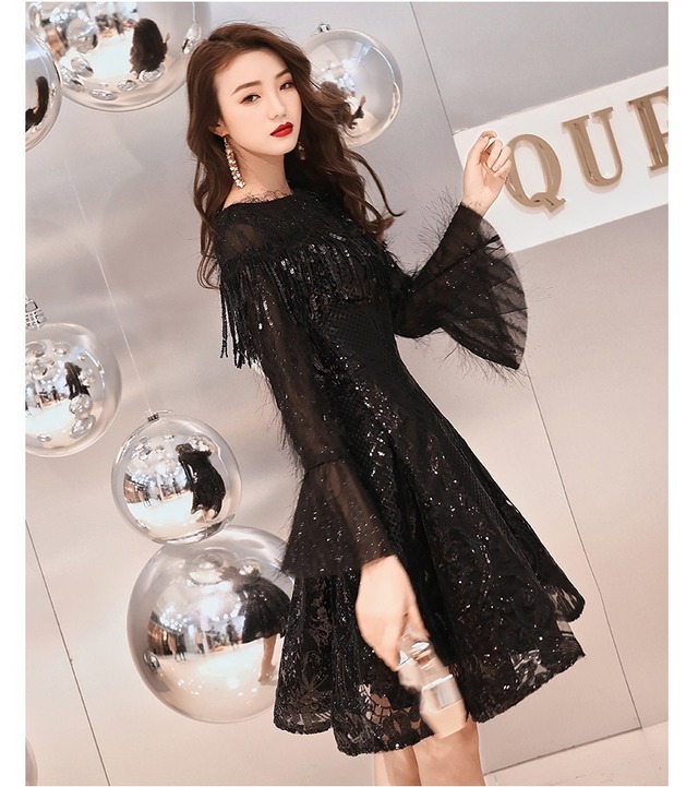 キラキラ スパンコール シースルースリーブドレス 長袖 ハイネック ショート丈 ブラック ka317