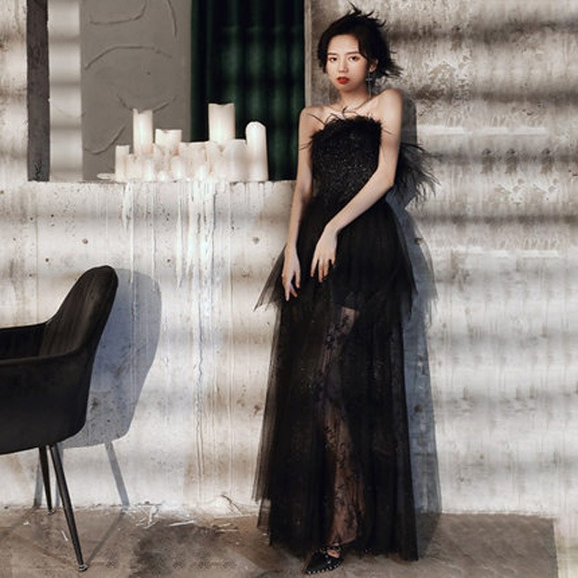 シースルースカート ビーズ装飾 ベアトップ ロング ブラック ka336