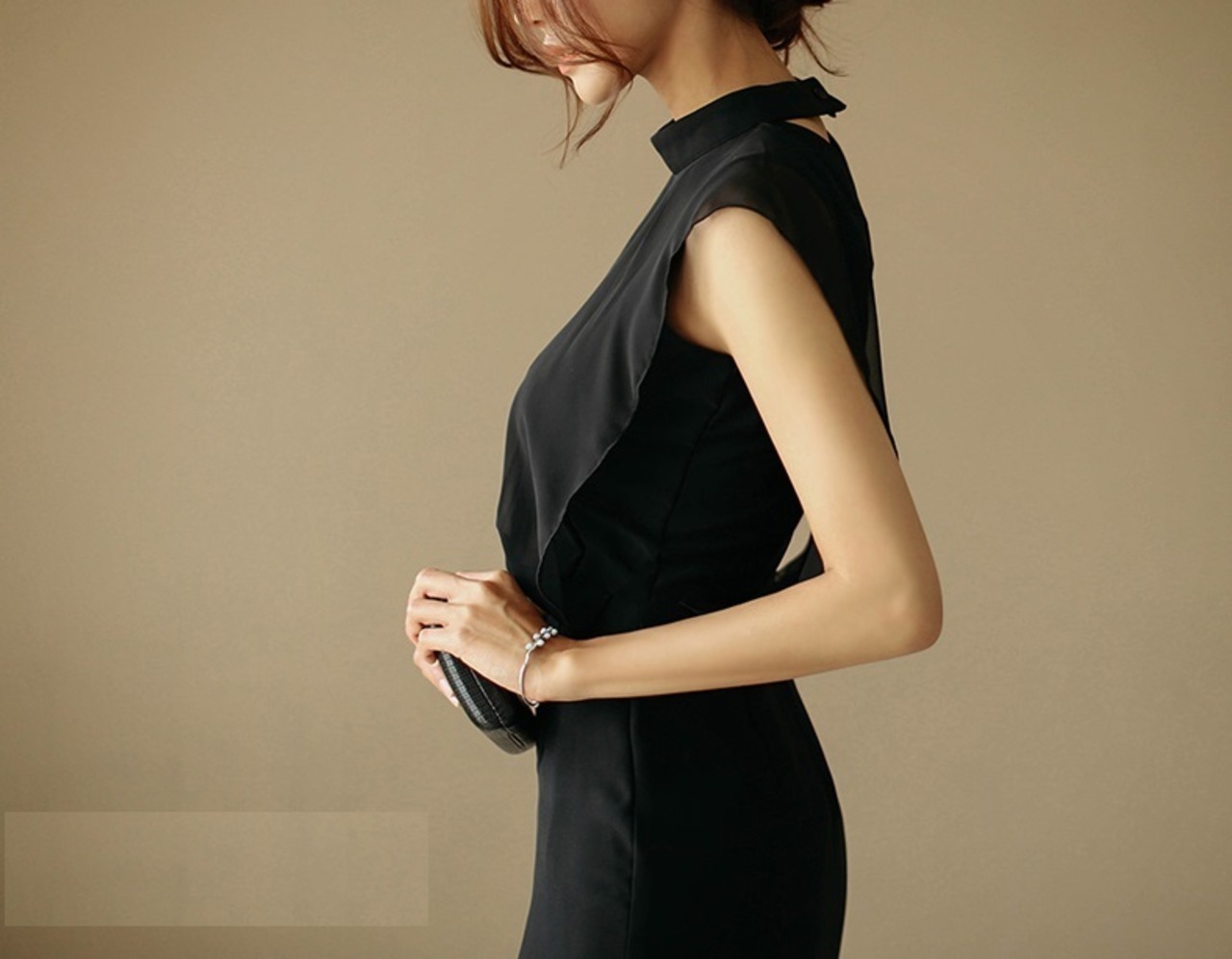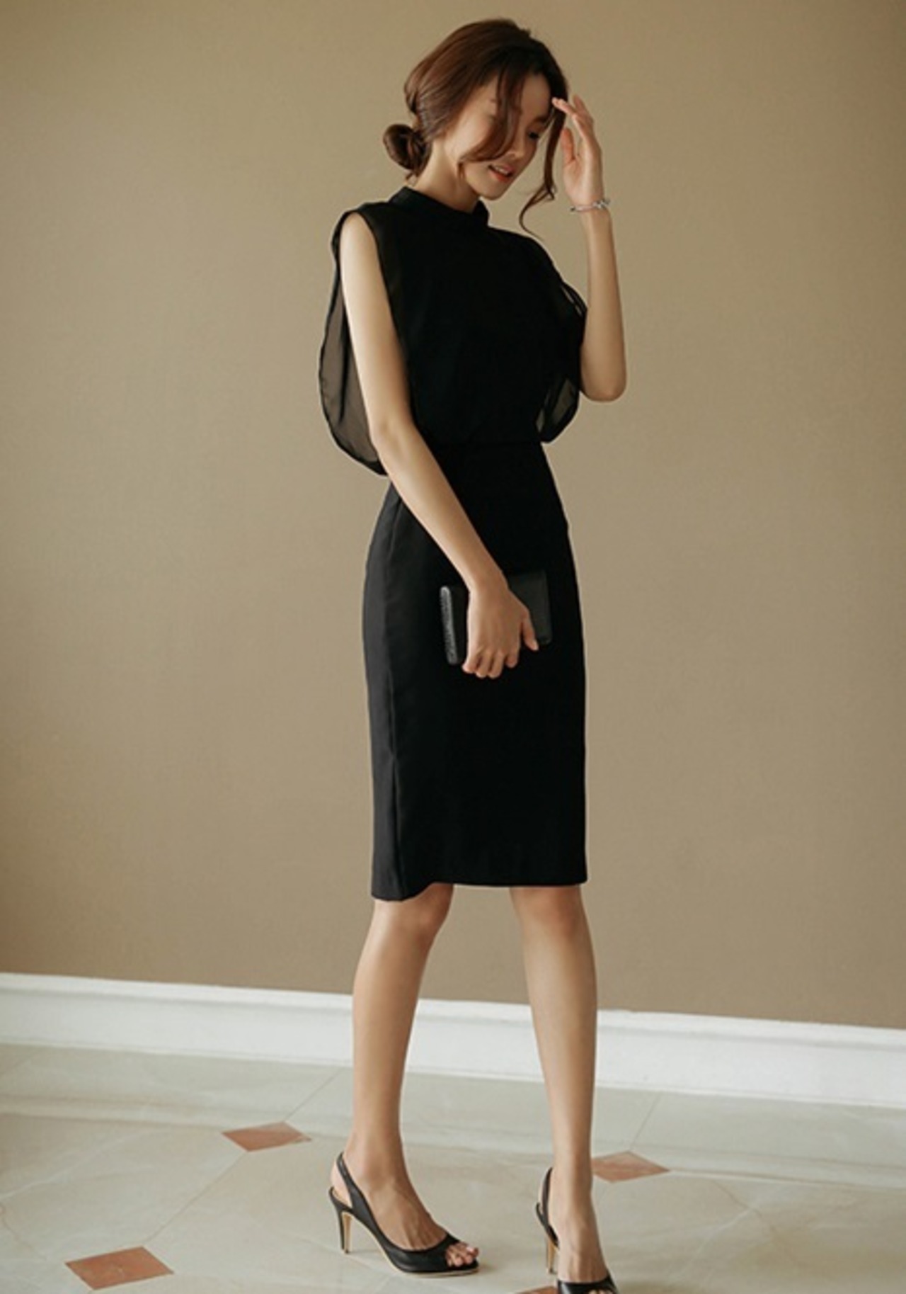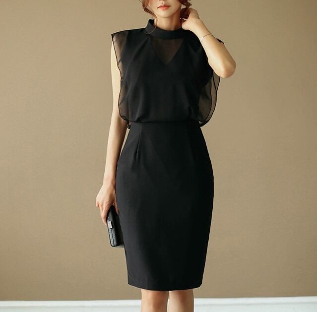 【再入荷】袖なし タイトドレス シフォン ハイウエスト ミディアム丈 スカート シンプル ノースリーブ S〜L ka13