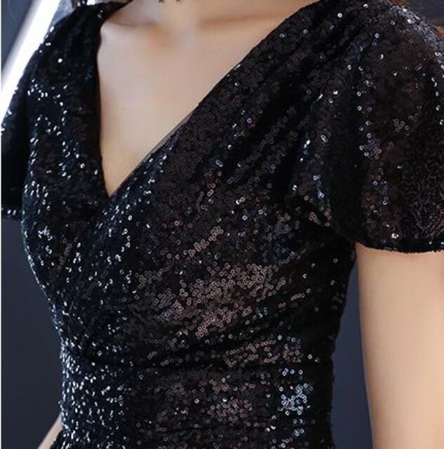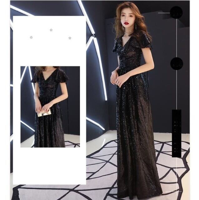 総スパンコール ラッフルスリーブ カシュクール ワンピース ドレス マキシ丈 ロングワンピース S〜4L ka76