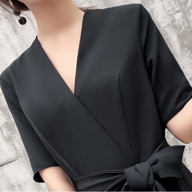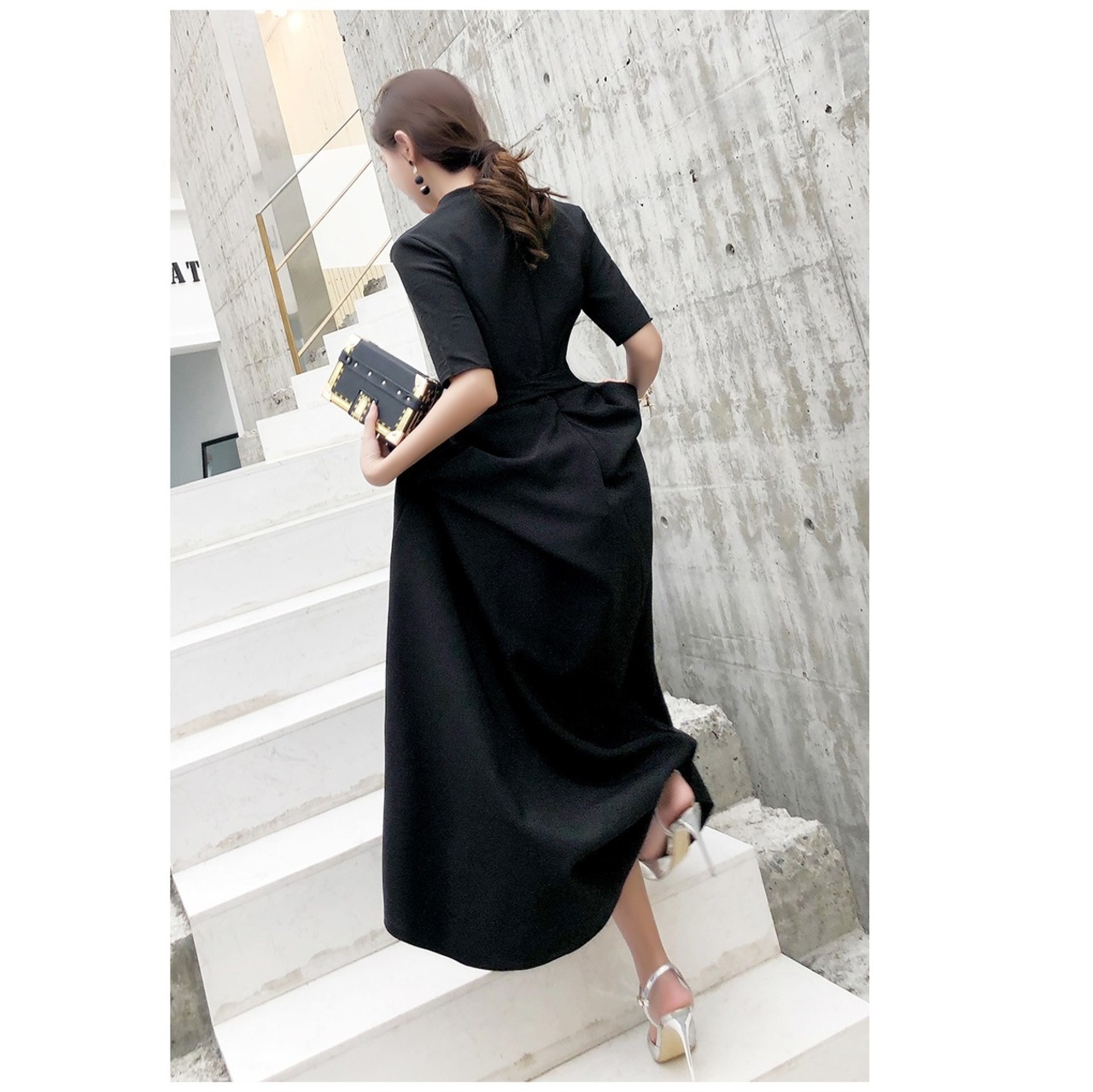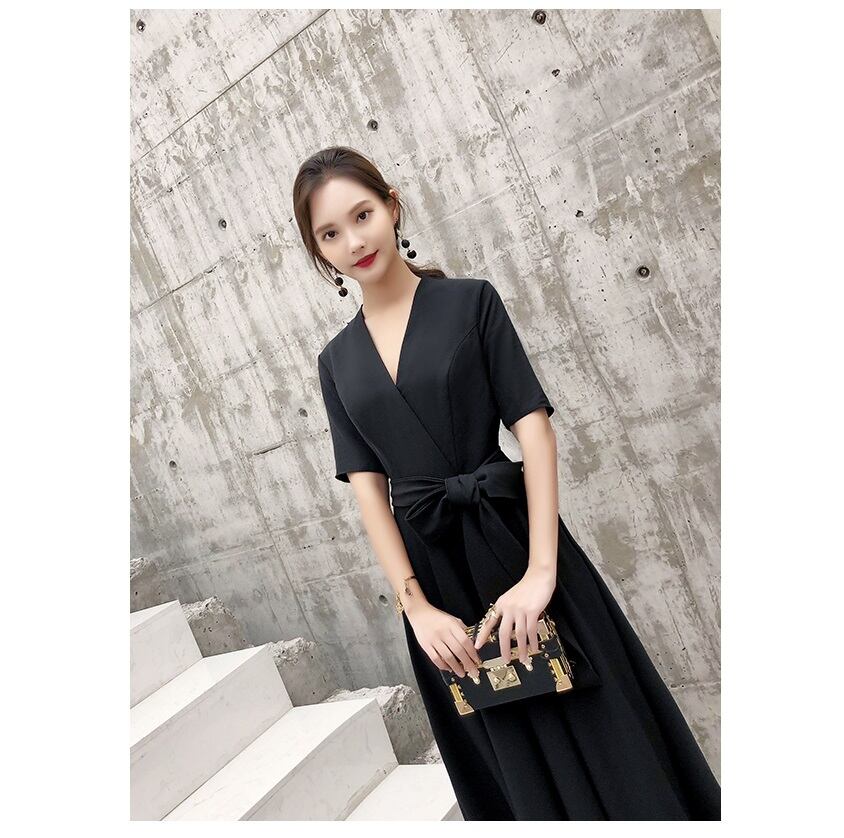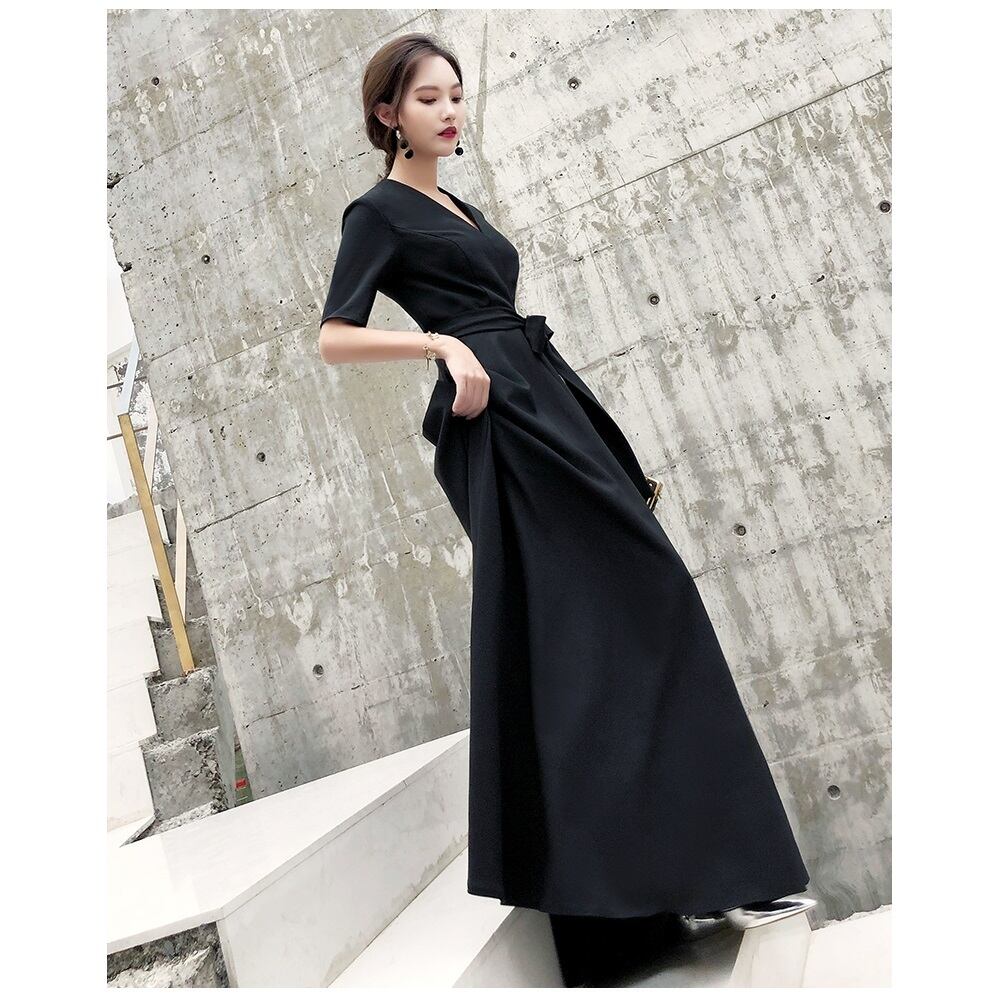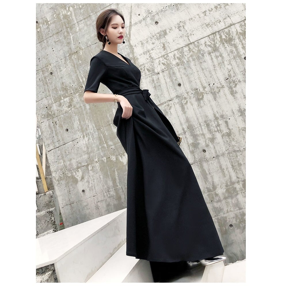 カシュクール Vネック ウエストリボン ロング丈 ワンピース ドレス シンプル パーティー 5分袖 司会 衣装 XS〜3L ka115