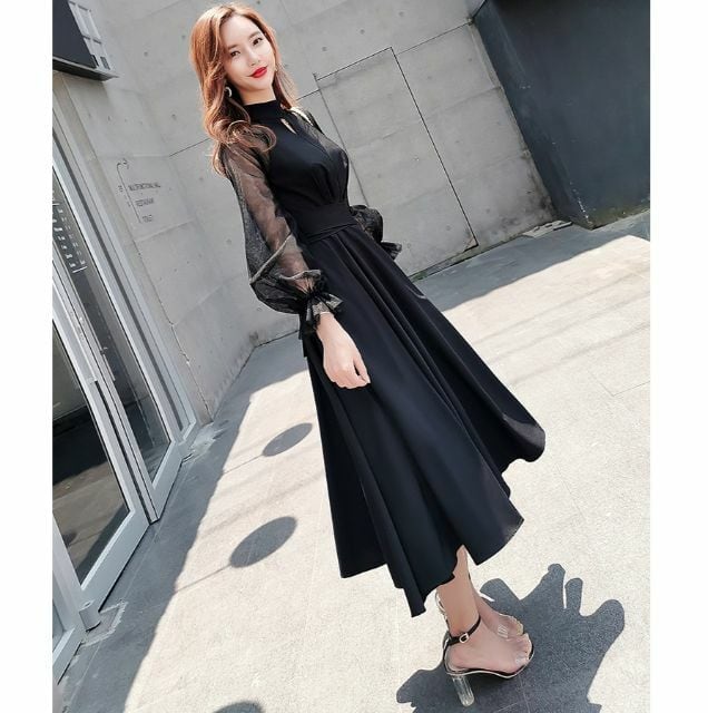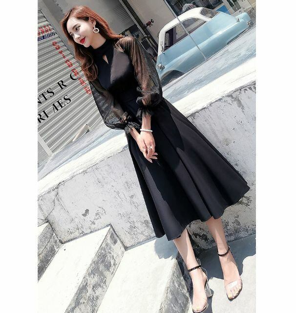 上品 ランタンスリーブ シンプル パーティードレス ブラック スリムフィット XS〜3L ka213