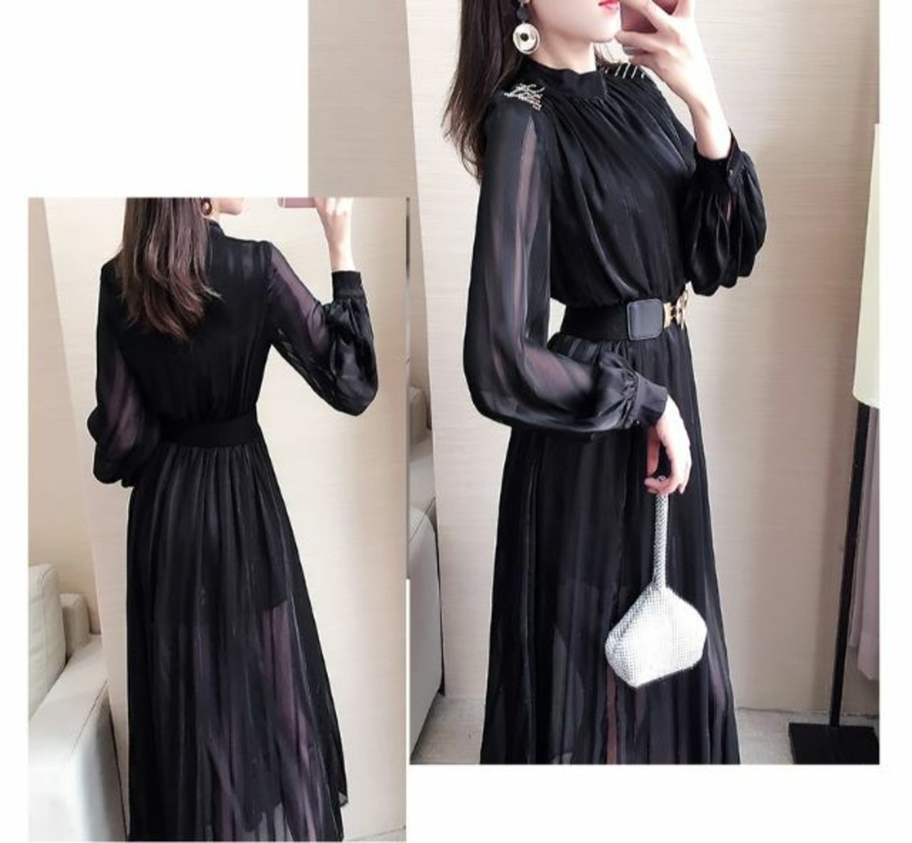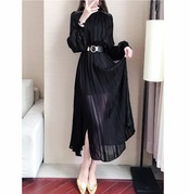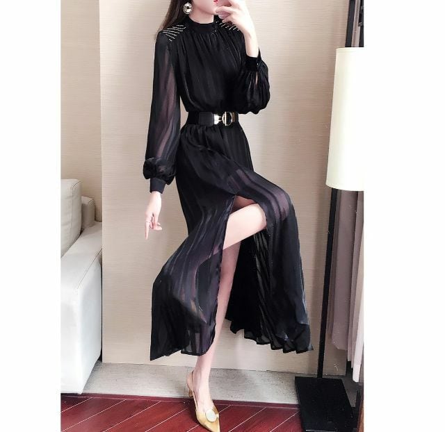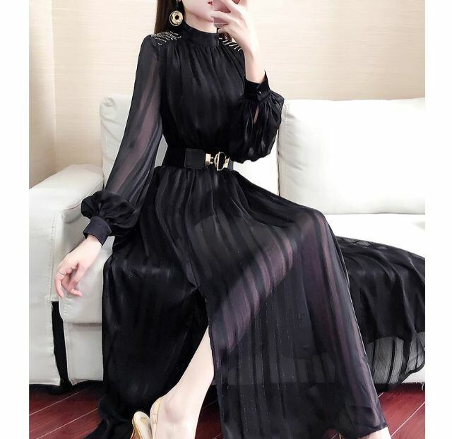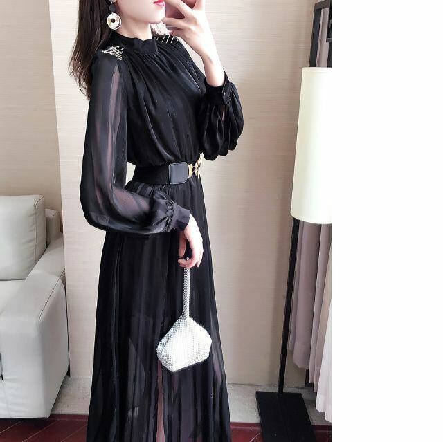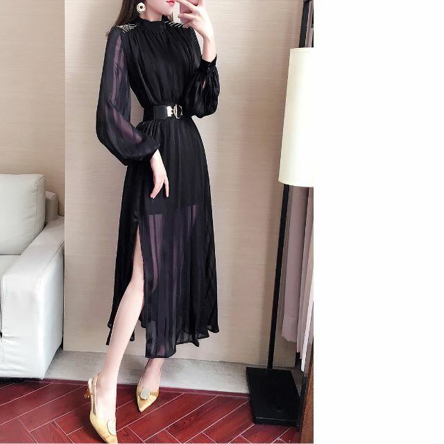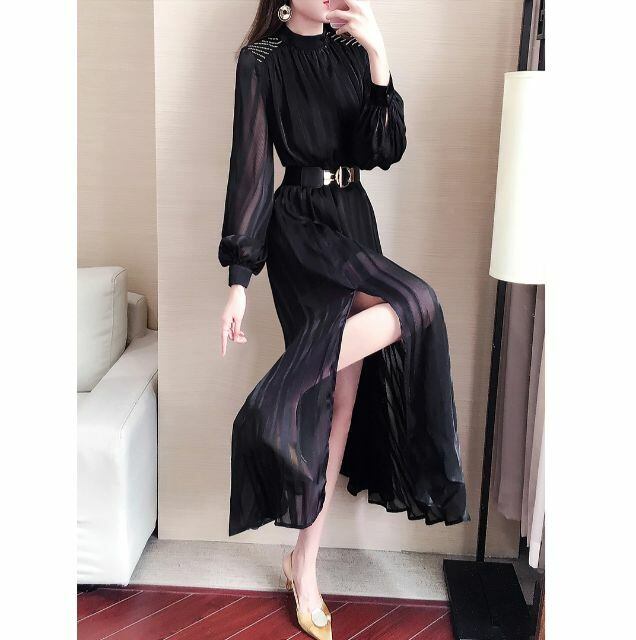 【再販】ベルト付 光沢 シフォン ドレス シースルー スリット ウエストベルト 結婚式 パーティー フォーマル S〜LL ka219