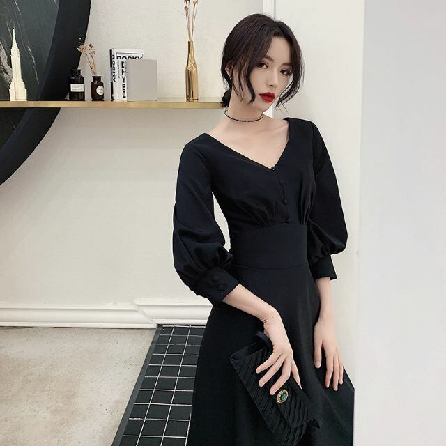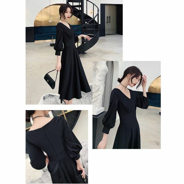深Vネック パフスリーブ フェミニン ワンピース ドレス ブラック 結婚式 S〜3L ka229