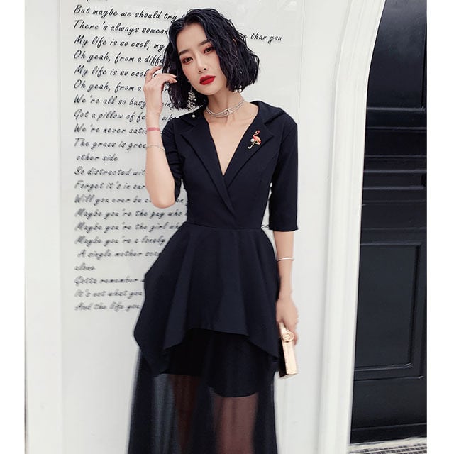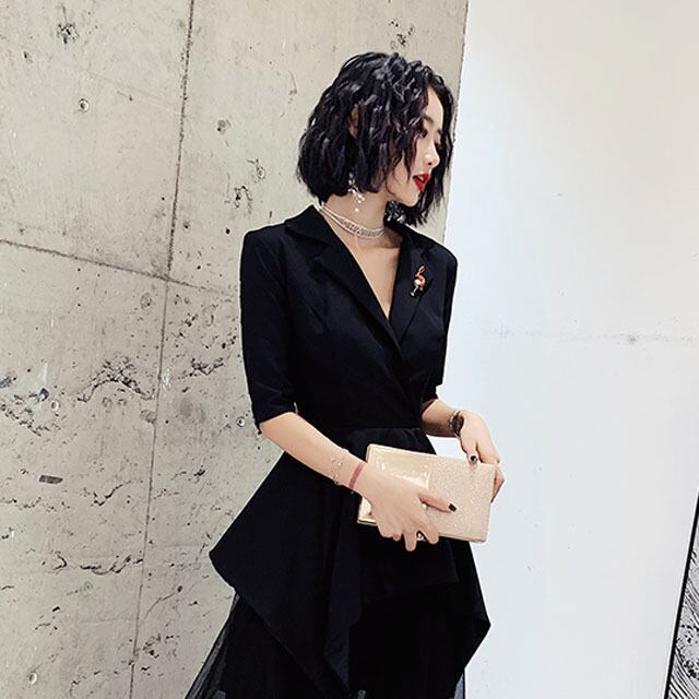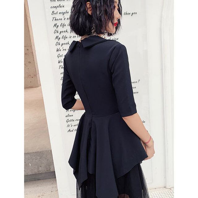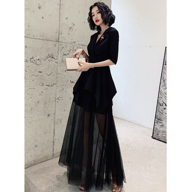 シースルー 高級感 五分袖 襟付 ロングドレス ブラック ka299