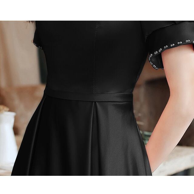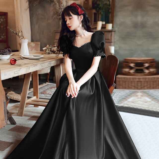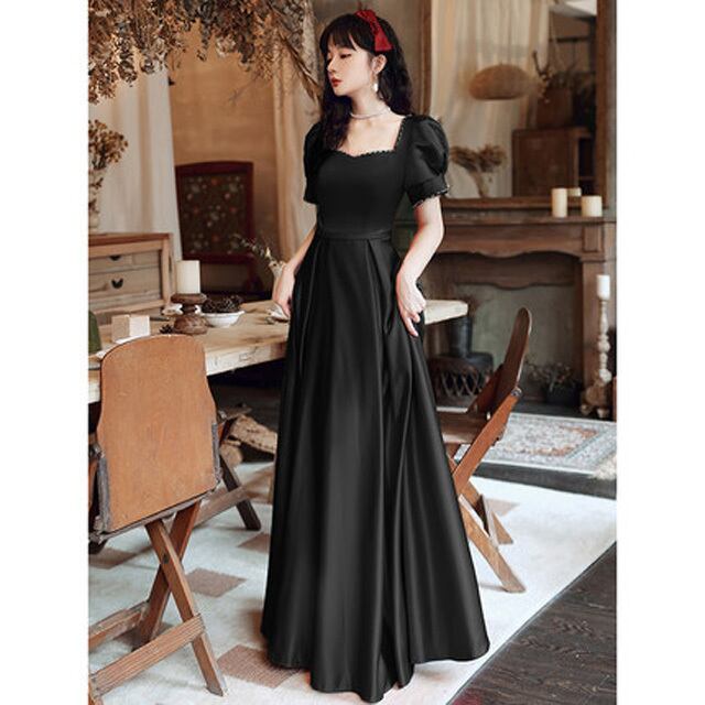 パフスリーブ エレガントドレス 半袖 デザインネック マキシ ブラック ka338