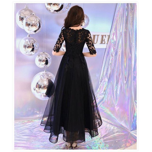 エレガントドレス 花柄レース 5分袖 ラウンドネック ロング ブラック ka393