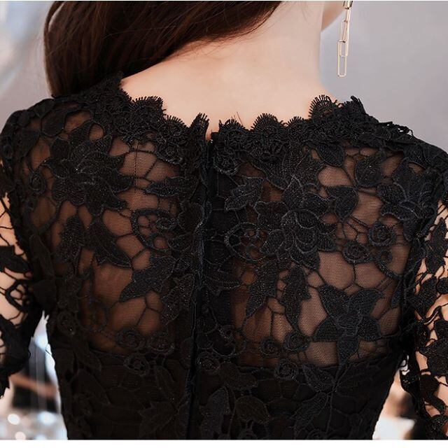 花柄レース エレガントドレス 5分袖 ラウンドネック ショート ブラック ka394