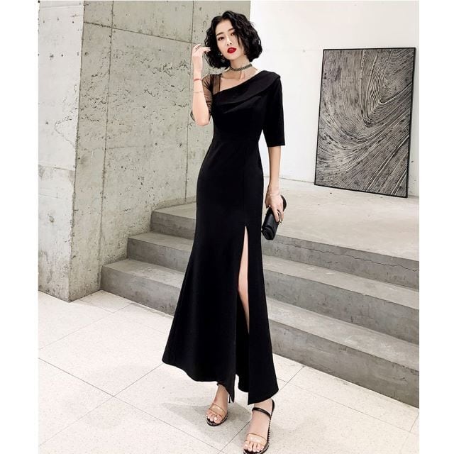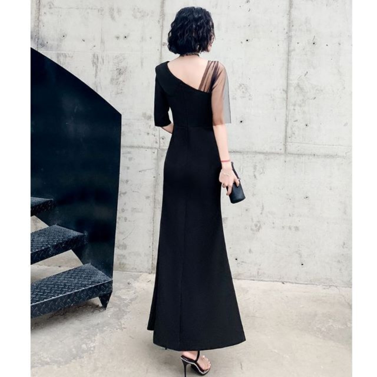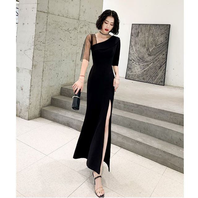 【人気商品】クール エレガントドレス スリッド 半袖 ロング ブラック ka440
