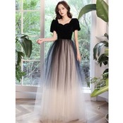 パフスリーブ イブニングドレス 半袖 Vネック ロング ブラック ka449