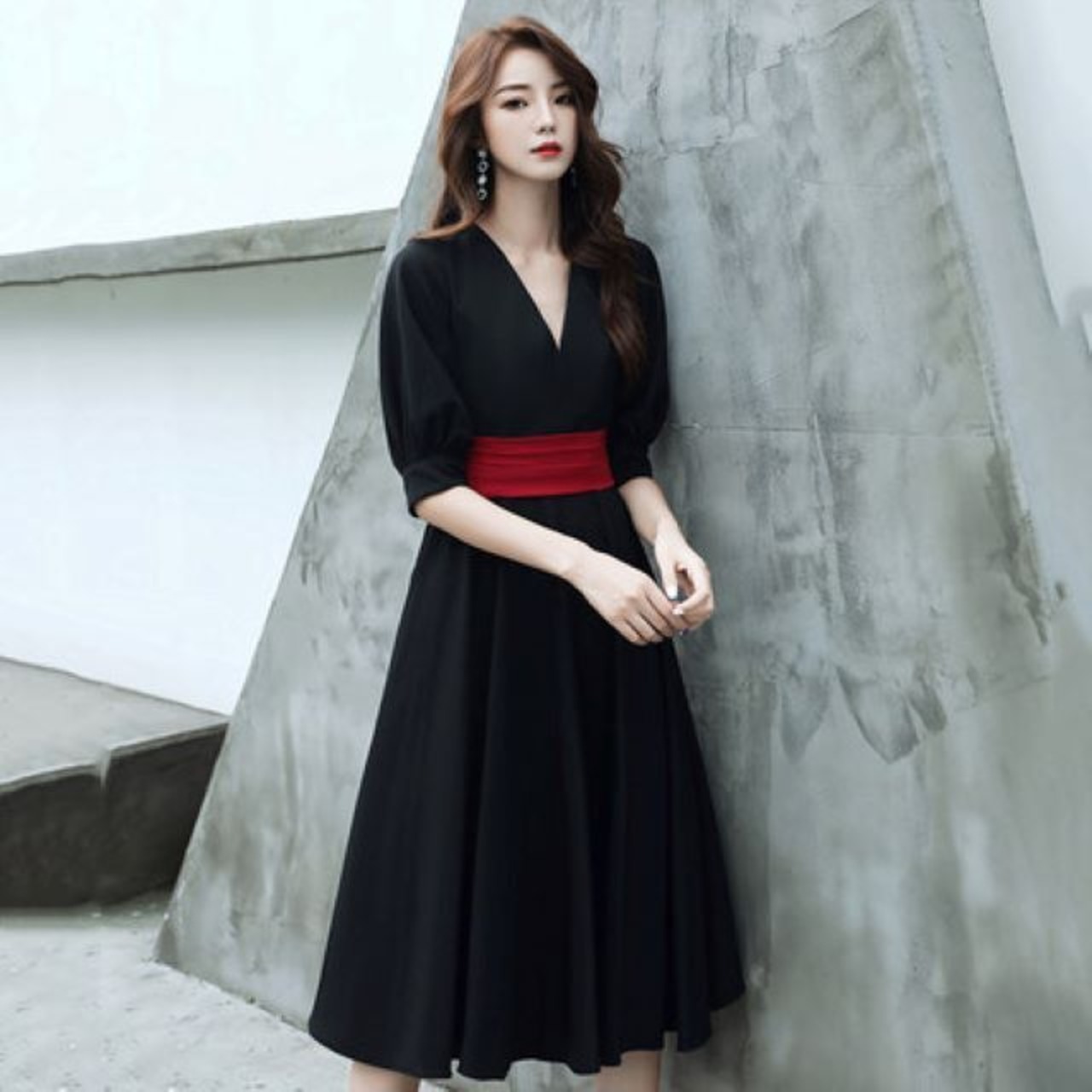 エレガント ウエストマーク 半袖 Vネック ミディアム ブラック ka492