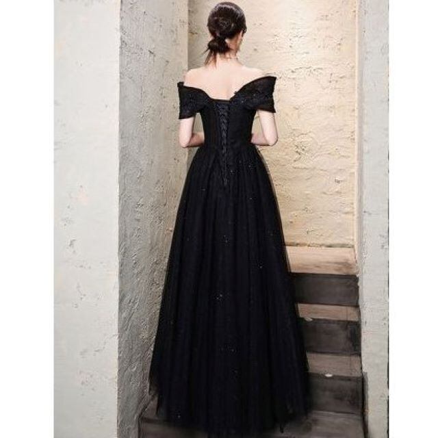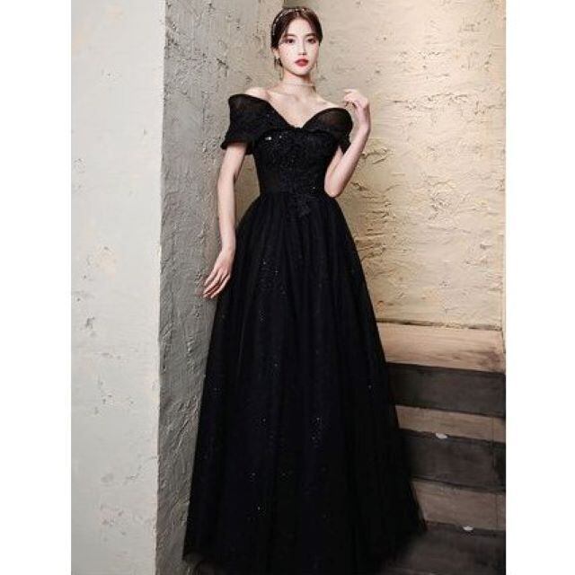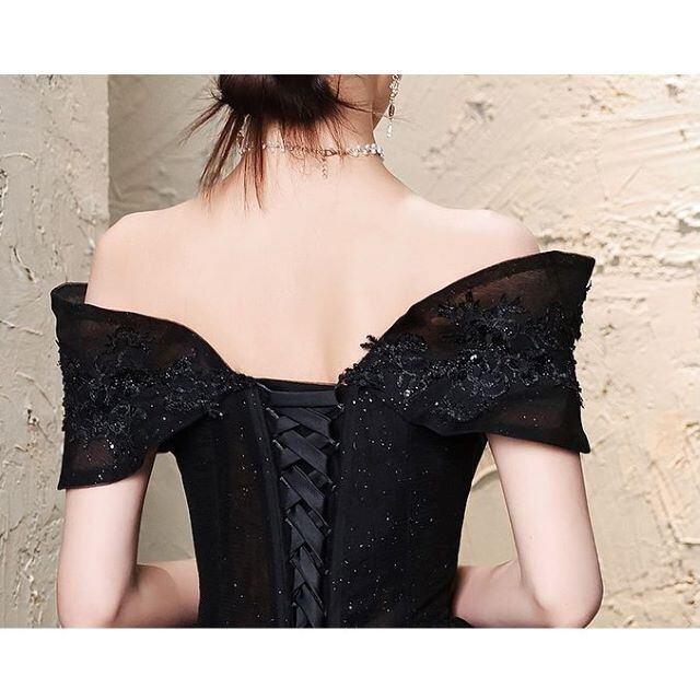 ラグジュアリー ビーズ ベアトップ オフショルダー ロング ブラック ka498
