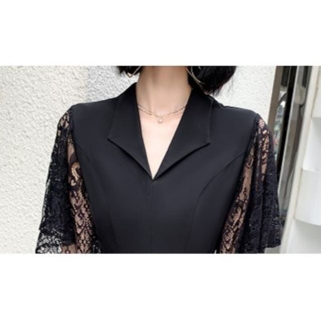 エレガントドレス オールインワン レース 襟付き 5分袖 Vネック パンツ ブラック ka540