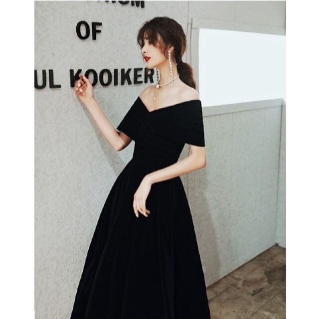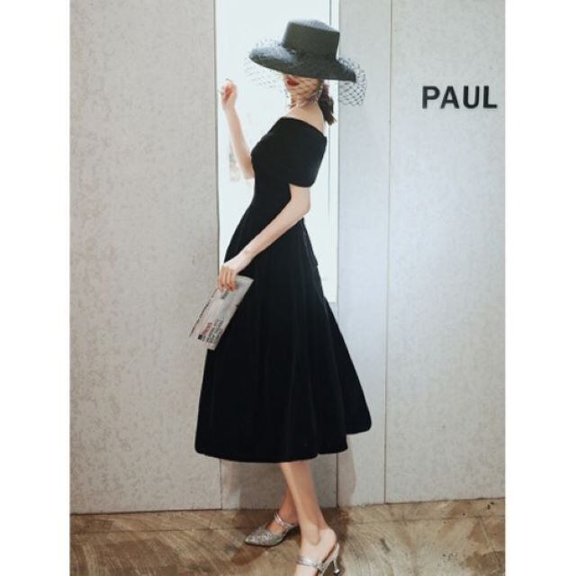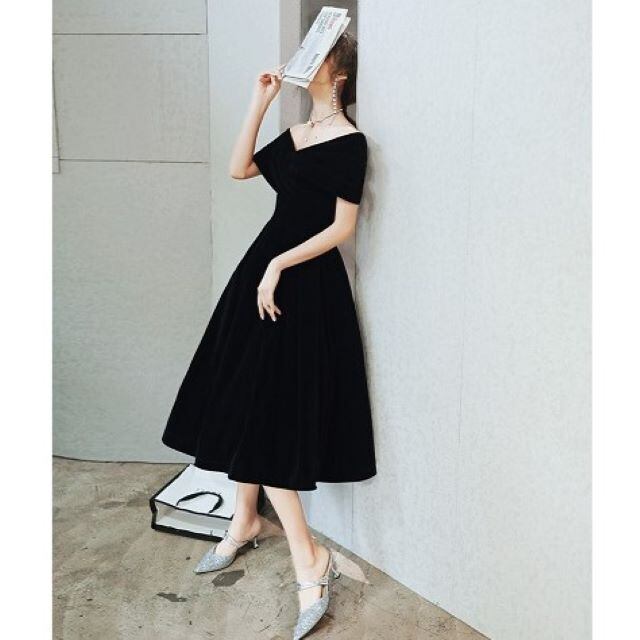 エレガントドレス シンプル モダン ノースリーブ オフショルダー ミディアム ブラック ka542