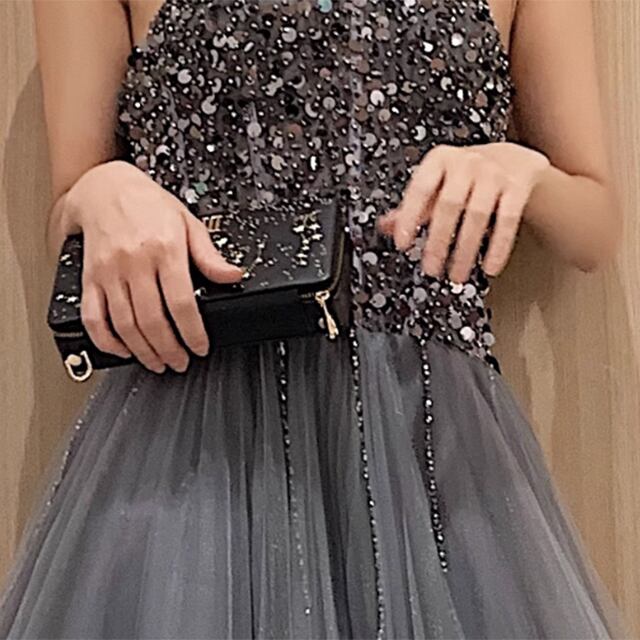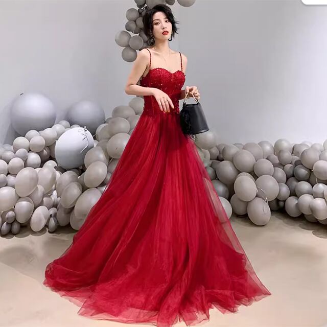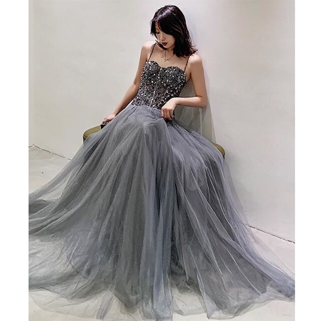 キラキラ輝くビーズが華やかなアクセントになった、肩ひも付きキャミソールネックのロングドレスが登場しました。