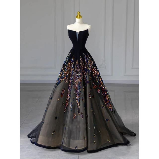 イブニングドレス スパンコール モダン ベアトップ ロング ブラック ka556